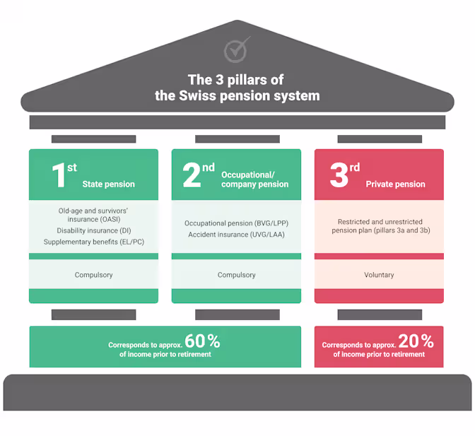 The first pillar is a basic, mandatory state pension known as AVS (Assurance Vieillesse et Survivants) in French, AHV in German or OASI in English. It is designed to cover essential living costs in retirement.